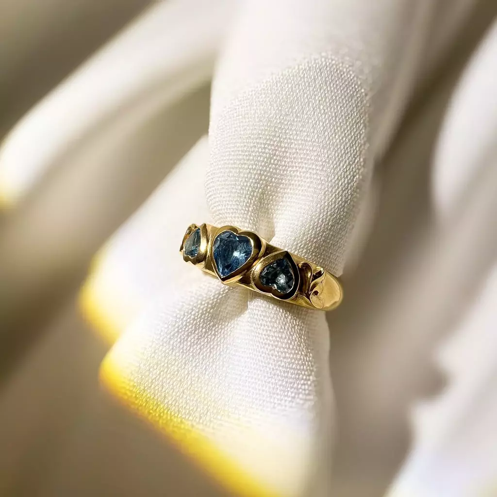 Anel feito em aro abaulado, com cravação estilo inglesa e arabescos laterais. Pedra central em lapidação coração de 5mm e laterais, também em lapidação coração, de 4mm cada. Disponível em prata 925, ouro amarelo 18k maciço e prata 925 com banho de ouro (20 milésimos).